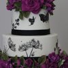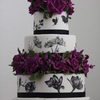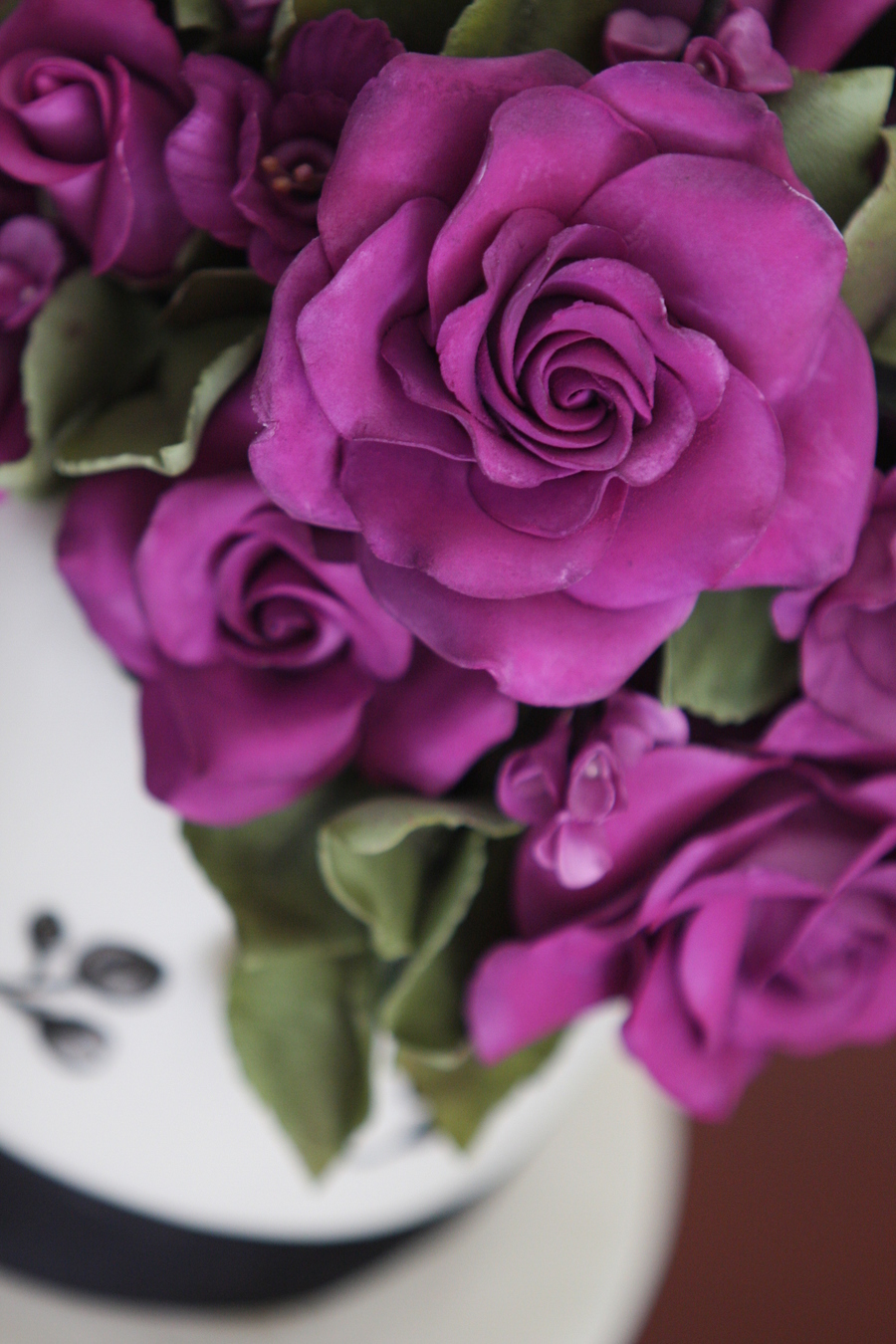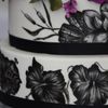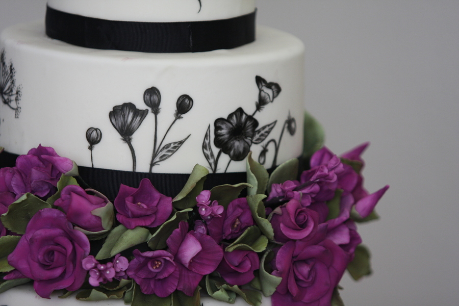 My version of Sylvia Weinstock's Wedding cake. Marshmallow fondant, Black food coloring for the hand painted flowers, and petal dust gumpase flowers
