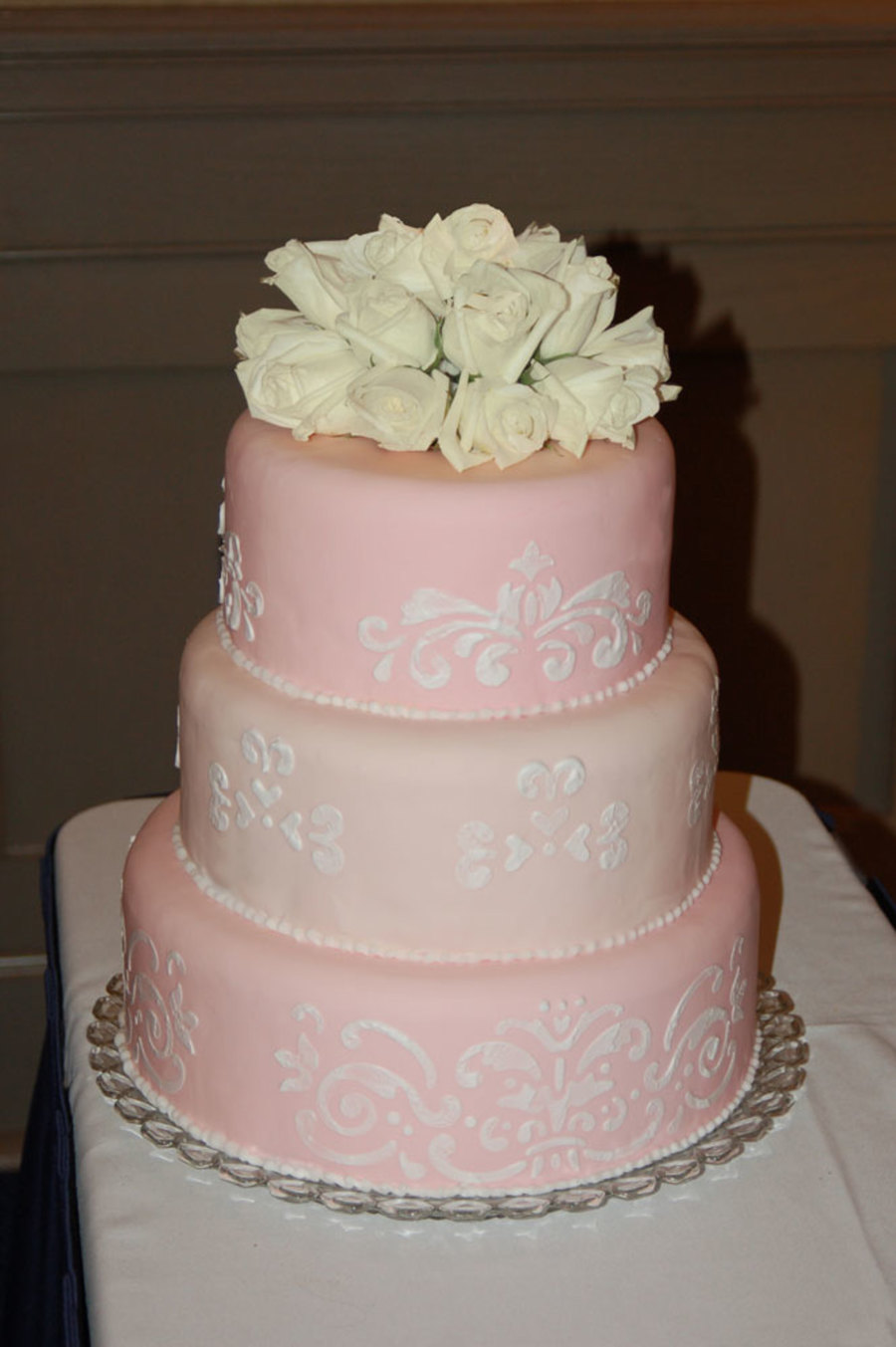 Display cake for a bridal show. Two subtle shades of pink fondant, accented with white royal icing.