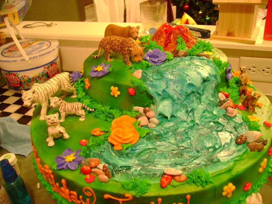 Buttercream with plastic animal figurines on top, later I added palm trees as well