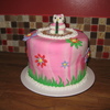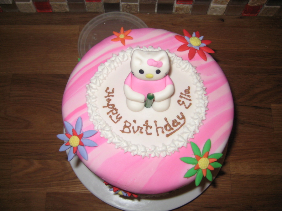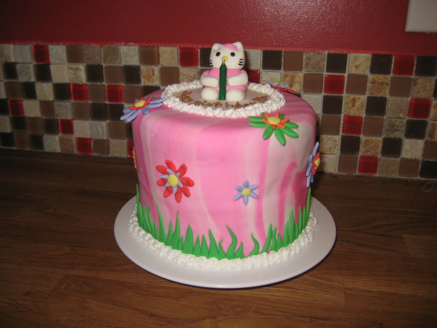 This was my daughters 6th birthday cake. She wanted Hello Kitty. I've only seen the cats head, never her body, so I guess she's too fat. Oh well. She likes cake. I love doing the swirled fondant. And the flowers were fun too.