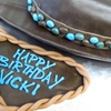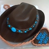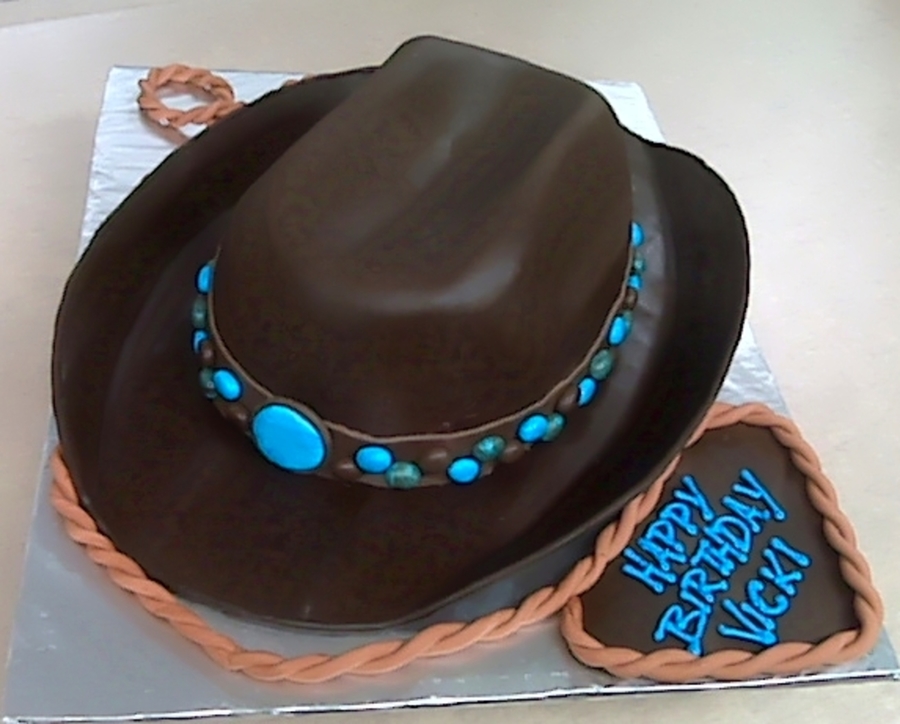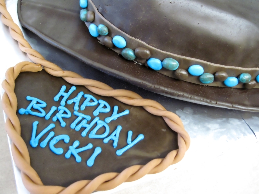 A cowboy hat cake for my niece. Chocolate cake with venetian creme filling, covered and decorated with fondant. Brim is fondant. My first cowboy hat cake.