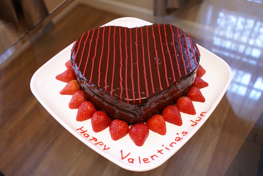 Chocolate Cake filled with Chocolate Fudge and covered in Chocolate Glaze and Strawberries