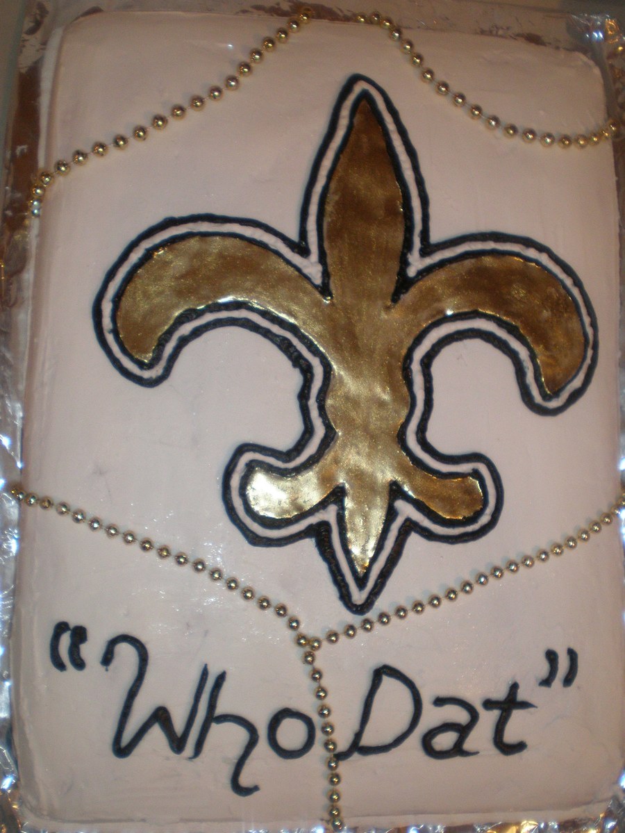 This is a plain white cake w/buttercream icing. The Fleur d Lis was made out of fondant and painted with gold luster dust. The luster dust was a great way to make the gold. The only thing not edible is the gold mardi gras beads I used to accent.
