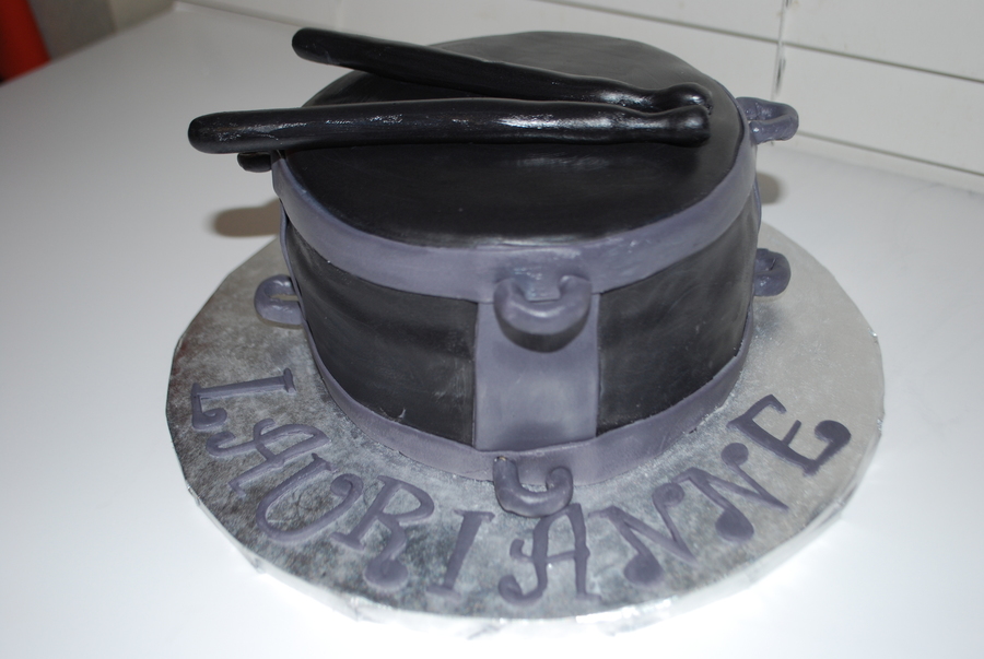6" cake, Satin Ice Black Fondant, the charcoal is black satin ice, wilton gumpaste, and white mmf. Birthday Cake for a 15 year old who plays drums in marching band.