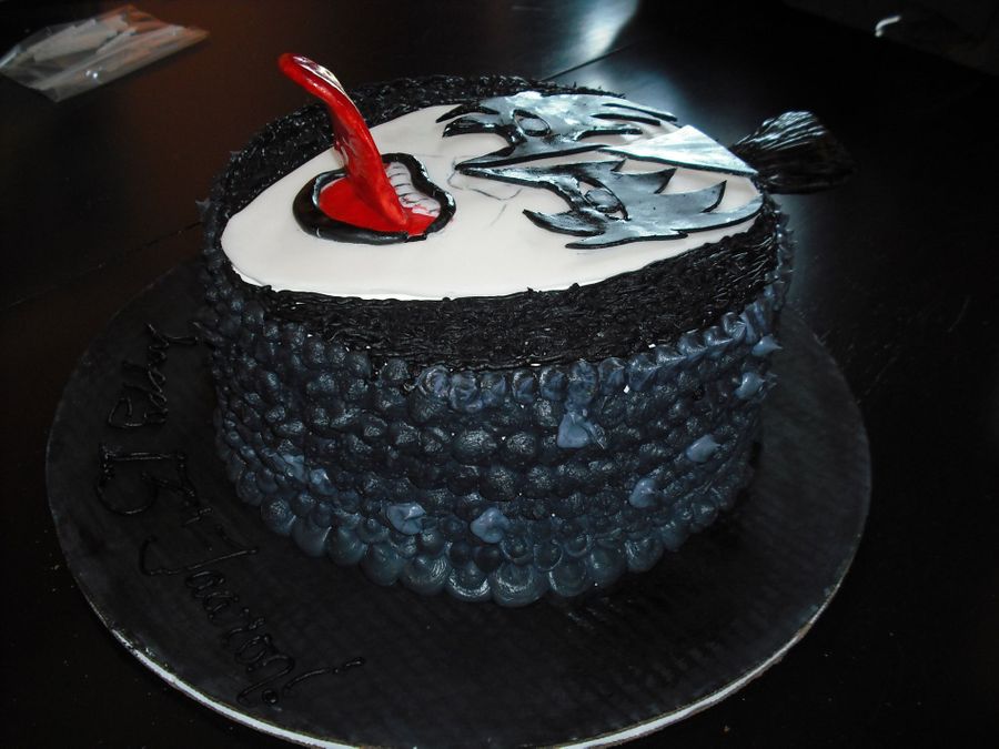 This was a cake I made for a fan of the band KISS. He loved it and everyone got a big laugh out of the tongue! I warned them about the black icing, but they still wanted it...they had a lot of fun seeing all of the party guests with black teeth and lips. :) Yellow cake with vanilla cream filling and better-cream brand icing. Mmf face, ponytail and tongue painted with gel food color.