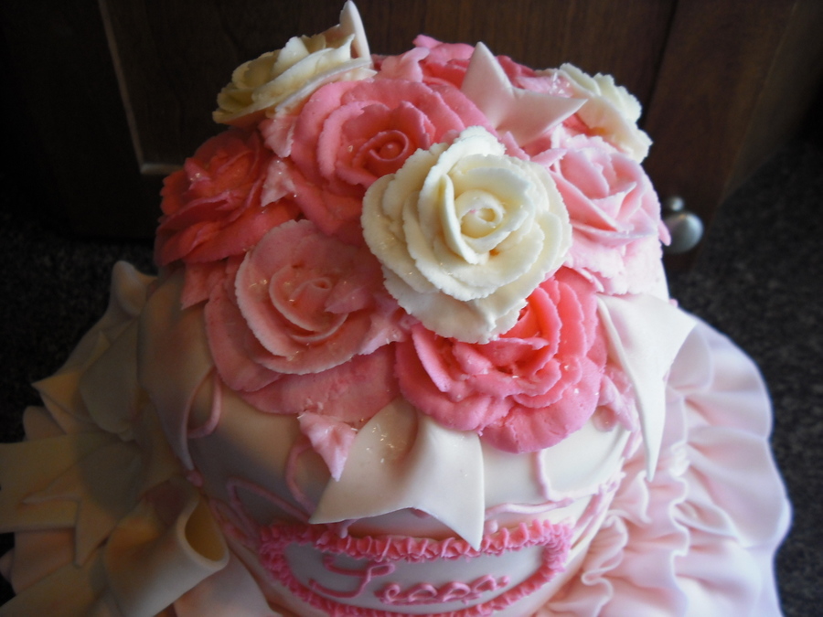 This was my daughter's birthday cake. She's a very girlie girl so her cake had to be pink and frilly. All of the ruffles and bows are mmf, the top tier is covered in mmf, but the roses are butter cream. Strawberry cake with strawberry cream filling, buttercream icing and mmf. I had a lot of inspiration from cc users...thanks a bunch!