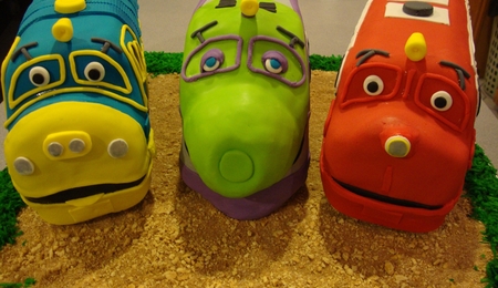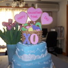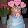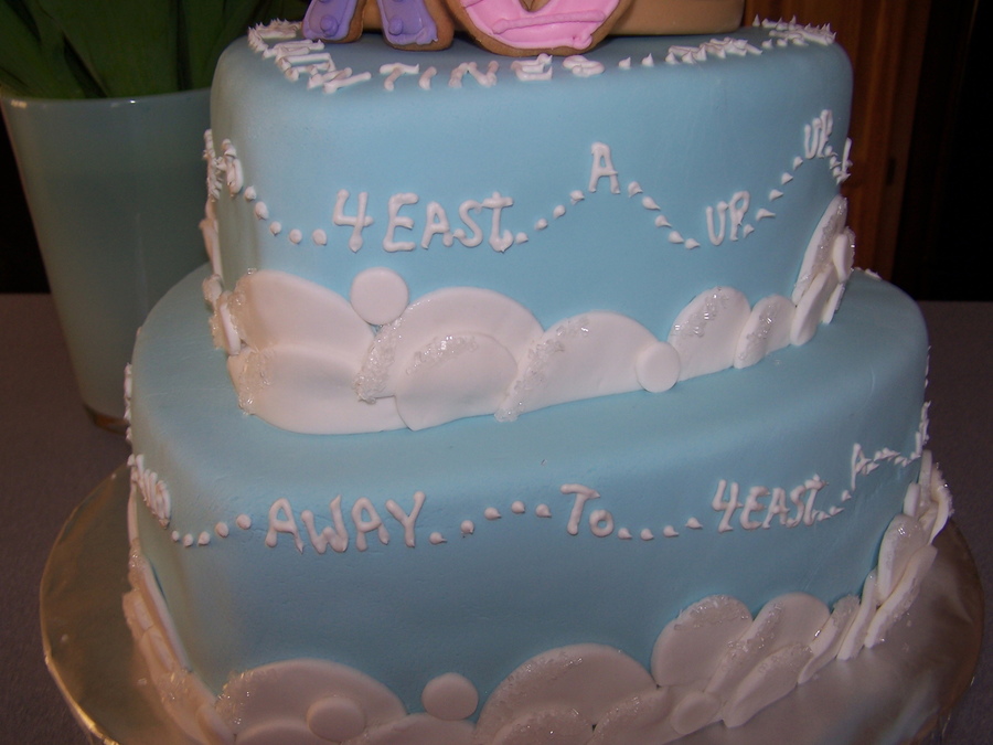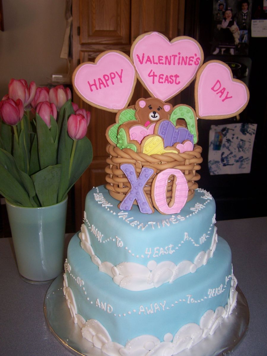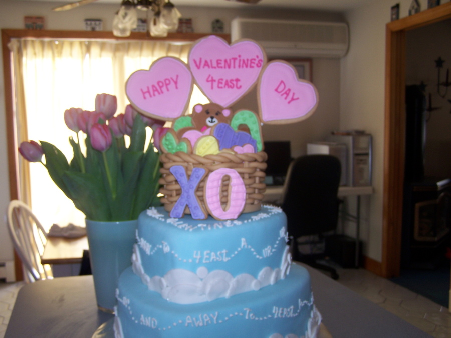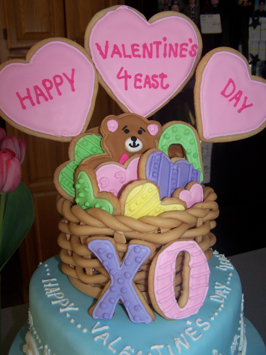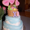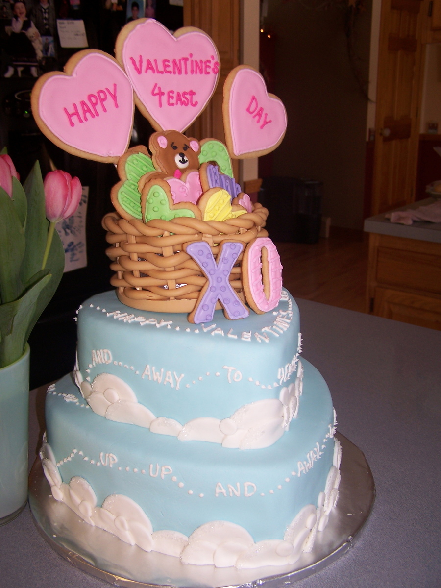 tiered cake w bc and satin ice fondant, sugar cookies w/color flow,candy clay basket, fondant acents TFL