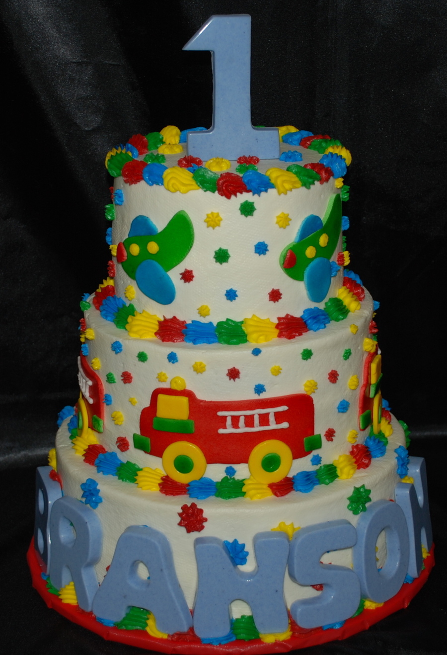 I enjoyed making this cake. My first time to cut fire trucks and airplanes and assemble them for a cake. The top and bottom tier are white cake and the middle tier is chocolate, all covered in buttercream and decorated with buttercream and MMF. The name and #1 is white chocolate mint. I watched Caked Boss and noticed that they fill their cakes with what looks like a 1M tip, I tried that and it was soooo much easier, I pressed the top layer down to help prevent icing bulging. It did bulge a little so I have to figure out how to prevent that when icing with buttercream and not adding MMF. Loved the technique though!!! TFL!!