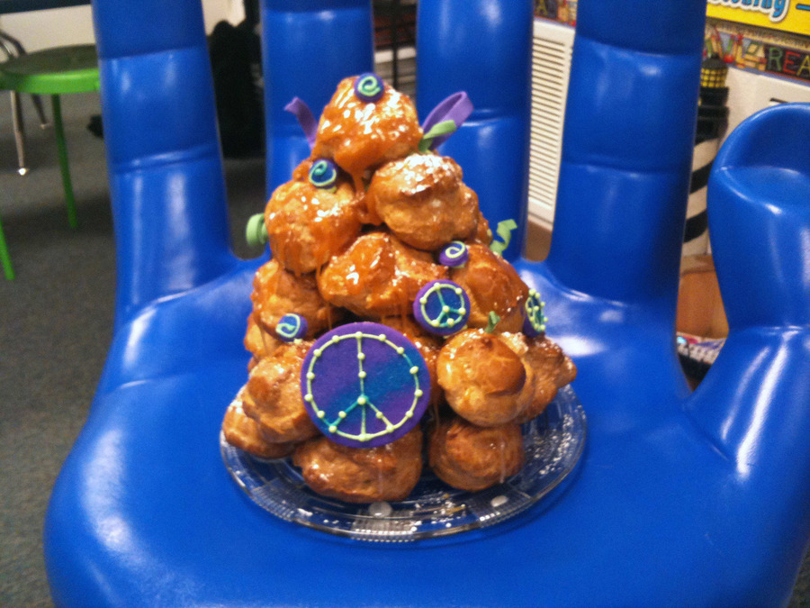 There probably hasn't been one of these made outside of France since 1971. It was a birthday cake for our first-grade teacher. She wears peace symbol jewelry all the time. I wanted to make a cream-puff tower a.k.a. the French wedding cake a.k.a. Croquembouche. So, I put it all together. TFL.