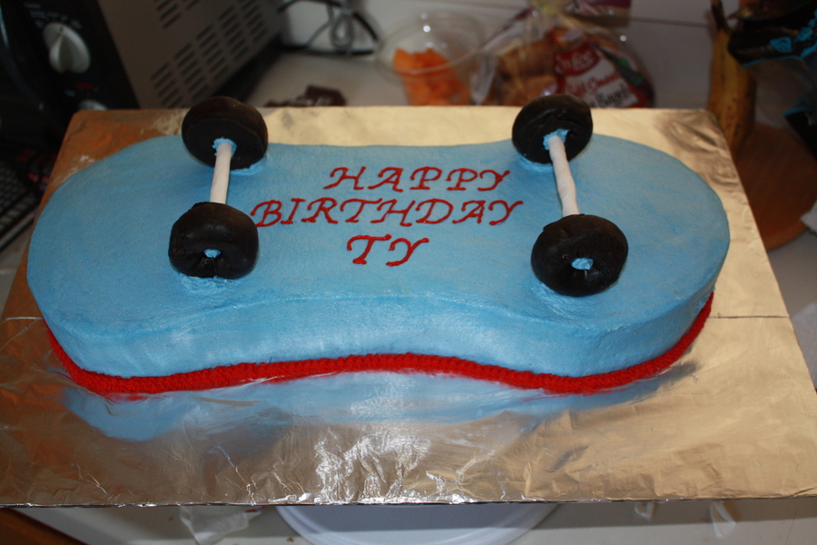 French Vanilla cake with buttercream fill and icing. Chocolate donut tires and fondant covered dowels.