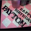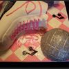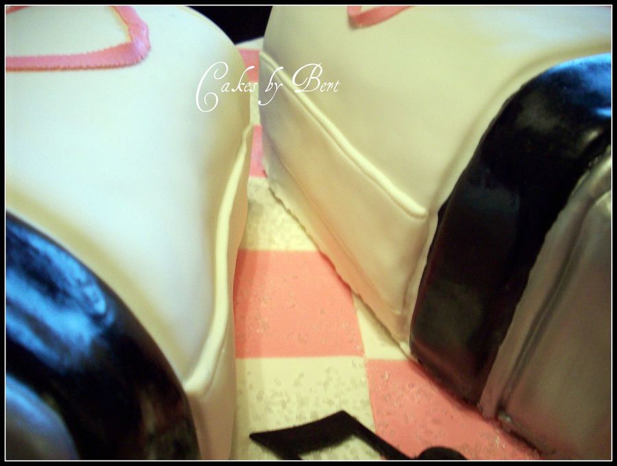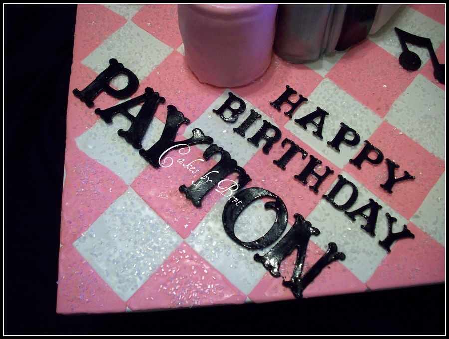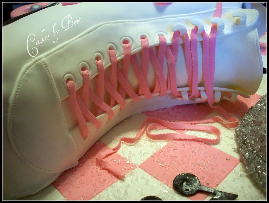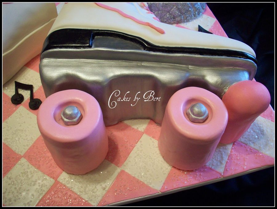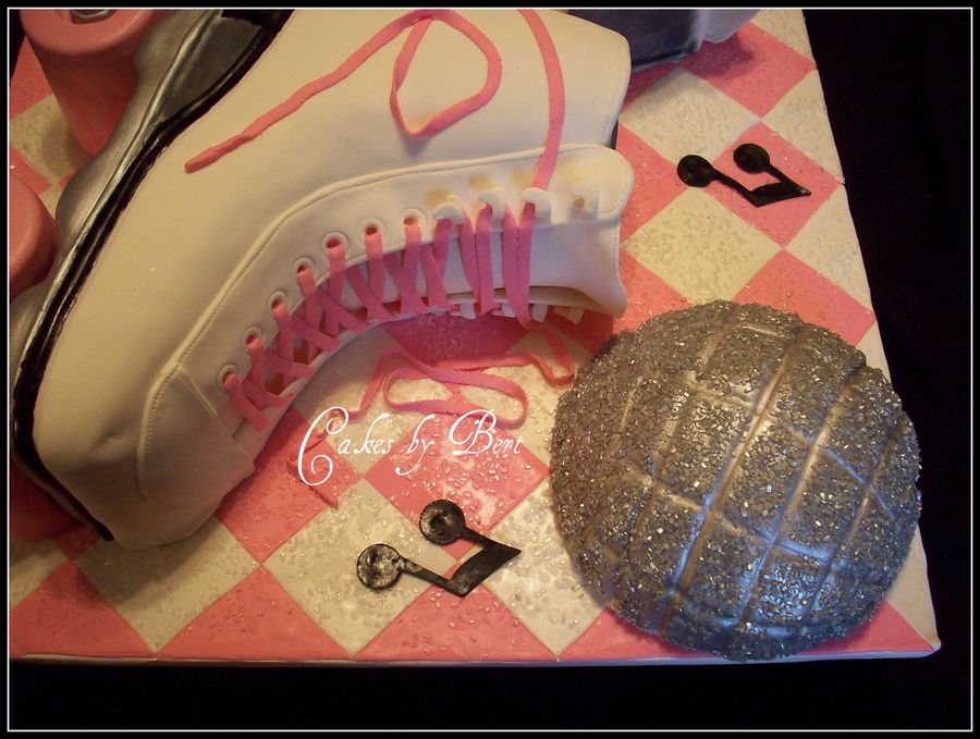 This was a fun cake to make. Everything is cake - skates are marbled cake, disco ball is chocolate. Covered in fondant. Grandmother ordered for 11 yr old. She didn't want standing up skates (darn!) so I went as extreme as I could without them standing. The whole cake matches the invitations. Disco ball painted with silver luster dust then sprinkled with silver peralized sugar crystals. Was a little disappointed with the laces, fondant just wouldn't come out of extruder smooth. Letters were cut out using cricut.