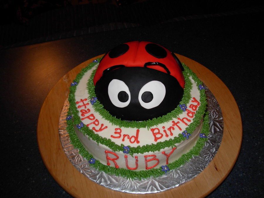 Ladybug cake done with half of the Wilton Sports Ball pan covered with red and black fondant. The rest of the cake is buttercream