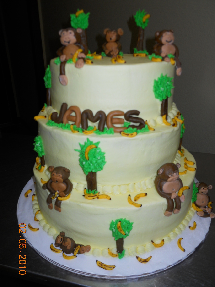 3 tier monkey cake for a first birthday at church. Iced with butter cream and fondant decorations