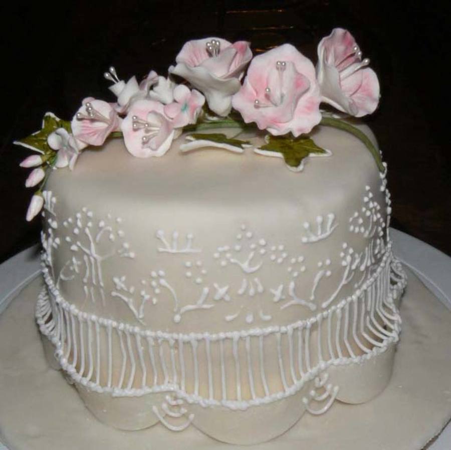 Cake is white, filled with buttercream. What a struggle. I didn't get a single string to stay away from the cake. Breaking was a problem, too. (The strings that are on the cake broken were made by the cake board flexing. Scream!!!)