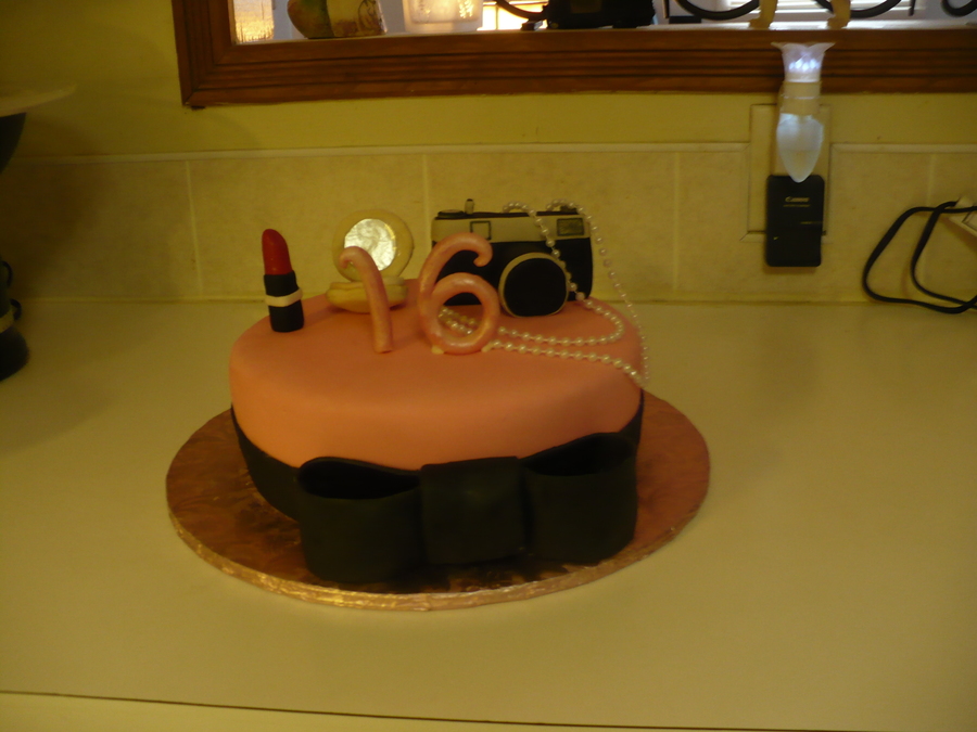 This is a Cake I made for a clients sweet 16 birthday. She loves pink, black, makeup, and taking pictures. This cake was a Maraschino Cherry Cake, w/ Chocolate Mousse filling, Butter cream frosting, and MMF. Decorations were made out of MMF, except the 16, that was made out of modeling chocolate. Enjoy!