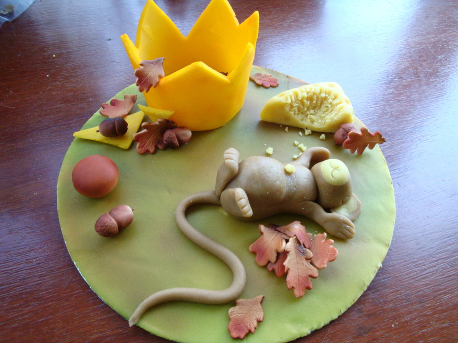 My project for my sugarpaste class. We had to copy the instructor's display of a garden mouse. To be cheeky, I added the wedge of cheese and gave the mouse a big belly. We practiced working with marzipan (mouse & pot) and using a spray gun to color the board and gumpaste leaves. It was fun working with marzipan and learning the texture and how to color marzipan. Thanks for looking.