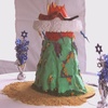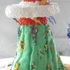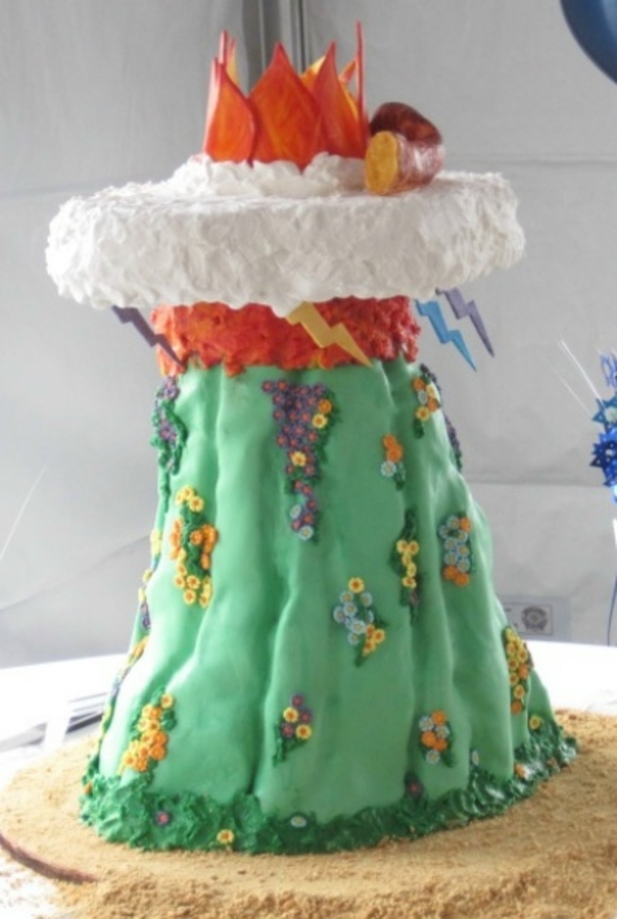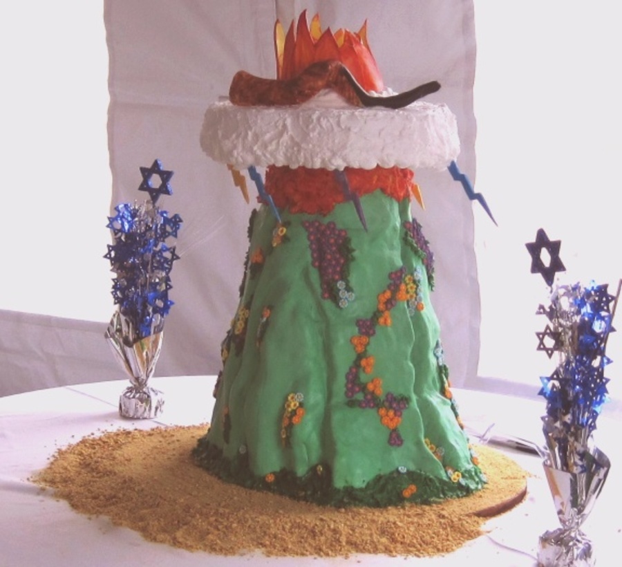 This cake represents part of the boy's Torah portion, when it describes God descending on Mt. Sinai to give the Ten Commandments. The Torah says "there were thunder claps and lightning flashes, and a thick cloud was upon the mountain, and a very powerful blast of a shofar.....Mount Sinai smoked because the Lord had descended upon it in fire." Finally, Jewish tradition says that even though the mountain was in the desert, it bloomed when God spoke. Half the cake was yellow cake w/lemon SMBC and the other half was chocolate w/vanilla SMBC. I used ganache under the fondant for the first time, and it was wonderful!