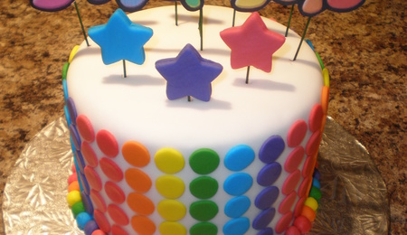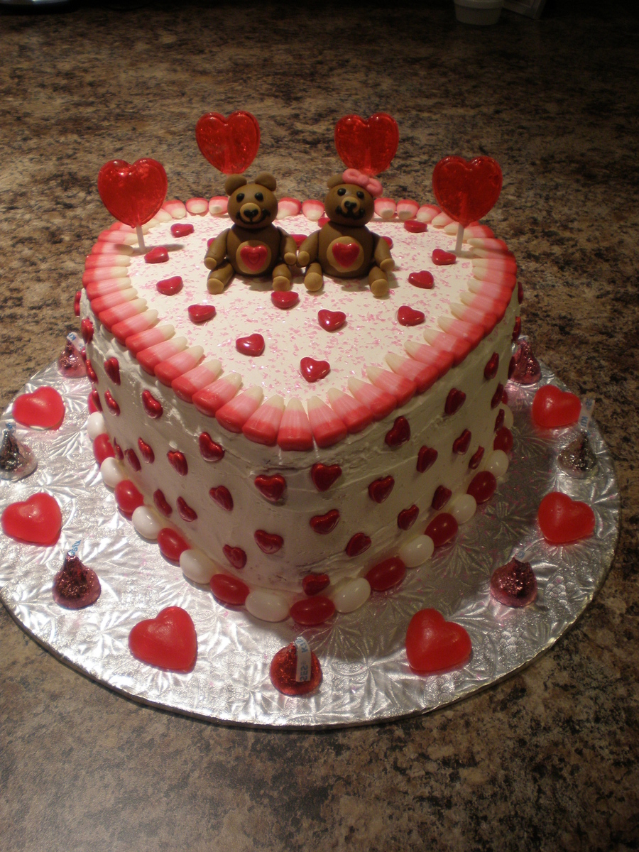 This is a cake I made as a donation for a Cake Walk at my friend's school. I figured something elegant wouldn't float the kids boats so I went with CANDY! I had originally put conversation hearts on the side but didn't like it so I replaced them with the red hearts but as everything else was already on the cake I couldn't get my BC smooth enough without hitting jelly beans or candy corns so it's messy! Good thing is, kids won't care! Some kid is going to be wired for a month!