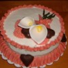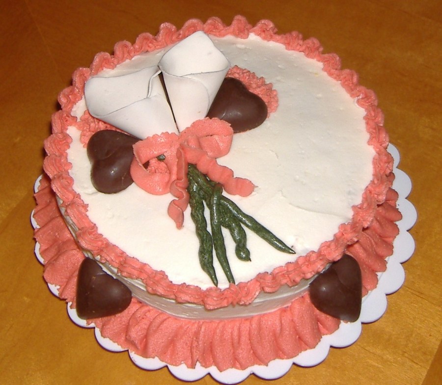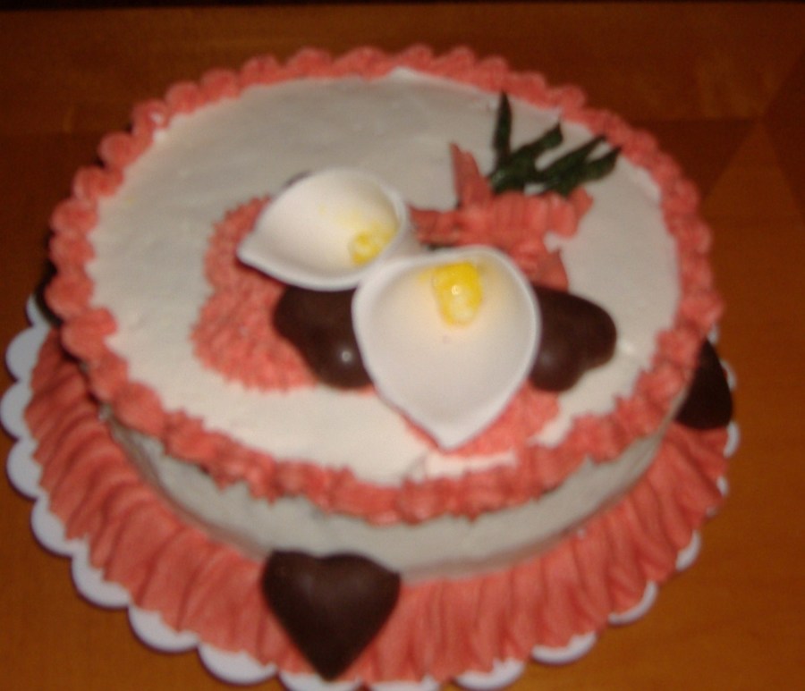 Chocolate cake w/vanilla carmel buttercream frosting w/ gumpaste Calilies, and chocolate hearts