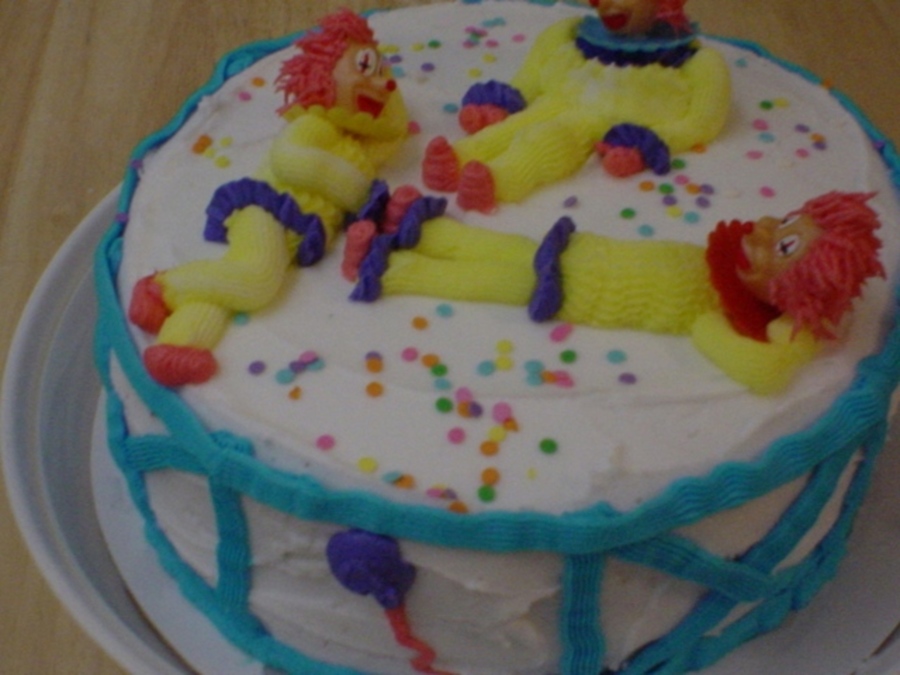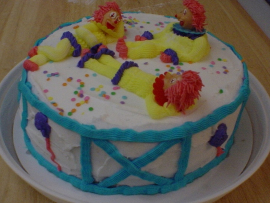 I made this in my first cake class several years ago, and when I put it in my cake carrier (a very small one was all I had at the time), the clowns got smashed down. : (