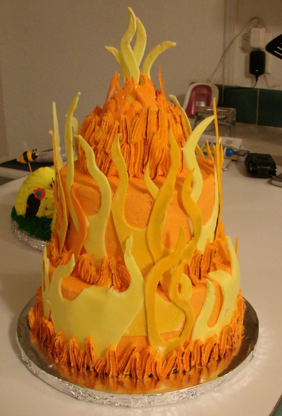 8",6" and sm.wondermold on top,chocolate cake with B/C frosting and filling.Flames are made of fondant