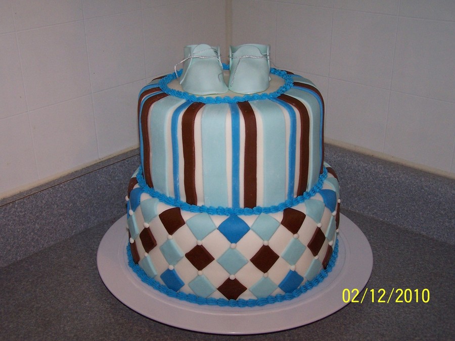 The lady I did the cake for wanted patches on the bottom and stripes on top. All blues and browns, with booties on the top. This is what I came up with. 10" white cake, 8" chocolate cake. All mmf. I used patchwork cutters diamonds to mark the fondant then I cut out each color diamonds and put them on the cake in place. Very time consuming but I think it turned out okay. The booties I used the cutter but still need to practice those.