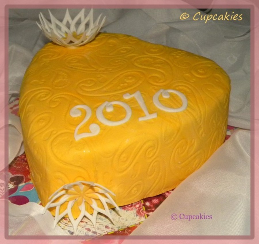 A yellow heart to celebrate the new year.. Cake covered in fondant. The lace flowers are made with gumpaste