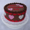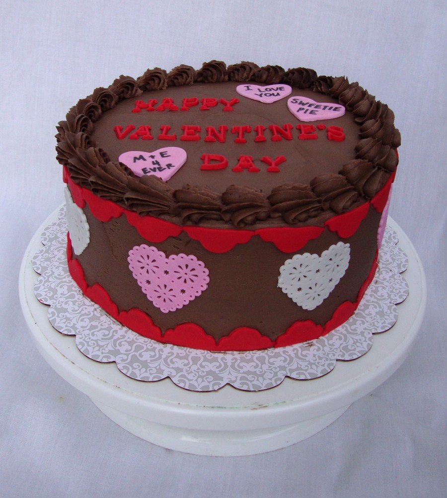 8" cake iced in chocolate buttercream, used my straight frill cutter set to do the red borders, and a new Martha Stewart heart punch for the hearts on the side- love how they turned out! I wanted a vintage feel. I wrote the little sayings with an edible pen on pink fondant heart cutouts. Used my new alphabet cutters for "happy valentine's day". TFL!