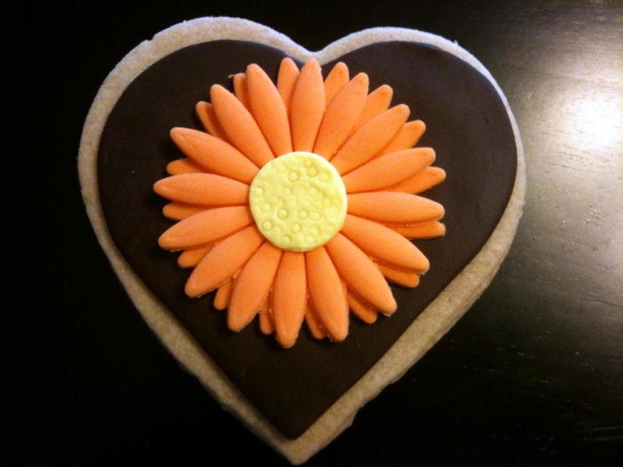 Peanut butter roll out cookie with chocolate fondant and MMF daisy. The customer gave me open reign on the design (all she cared about was the PB cookies with chocolate fondant), so I decided to play with my new cutter.