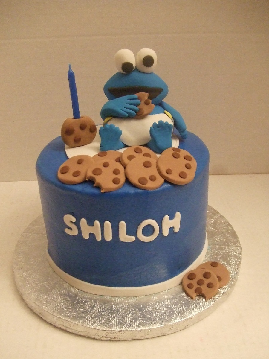 This is a small 6 inch smash cake for a baby turning 1. the cake was a vanilla butter cake with buttercream filling and covered in buttercream. Cookie monster and the cookies were made of gumpaste. TFL