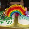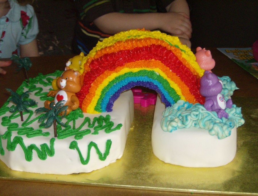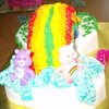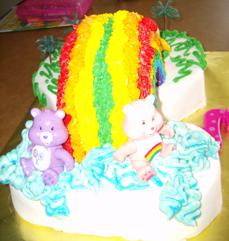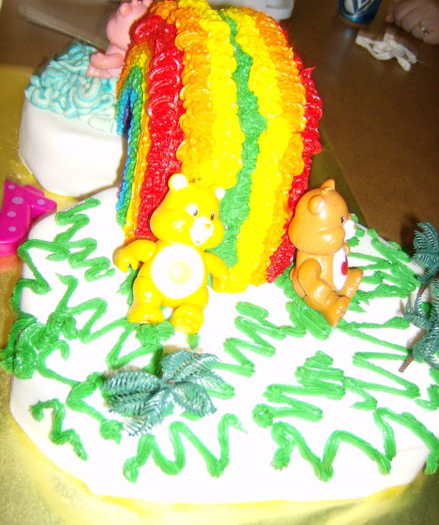 This was my niece's 2nd birthday cake. She wanted carebears that she could keep. I wanted to see if I could get a 3-D rainbow to stand up and it worked!! The kids at the party all thought the "island side" was Hawaii.