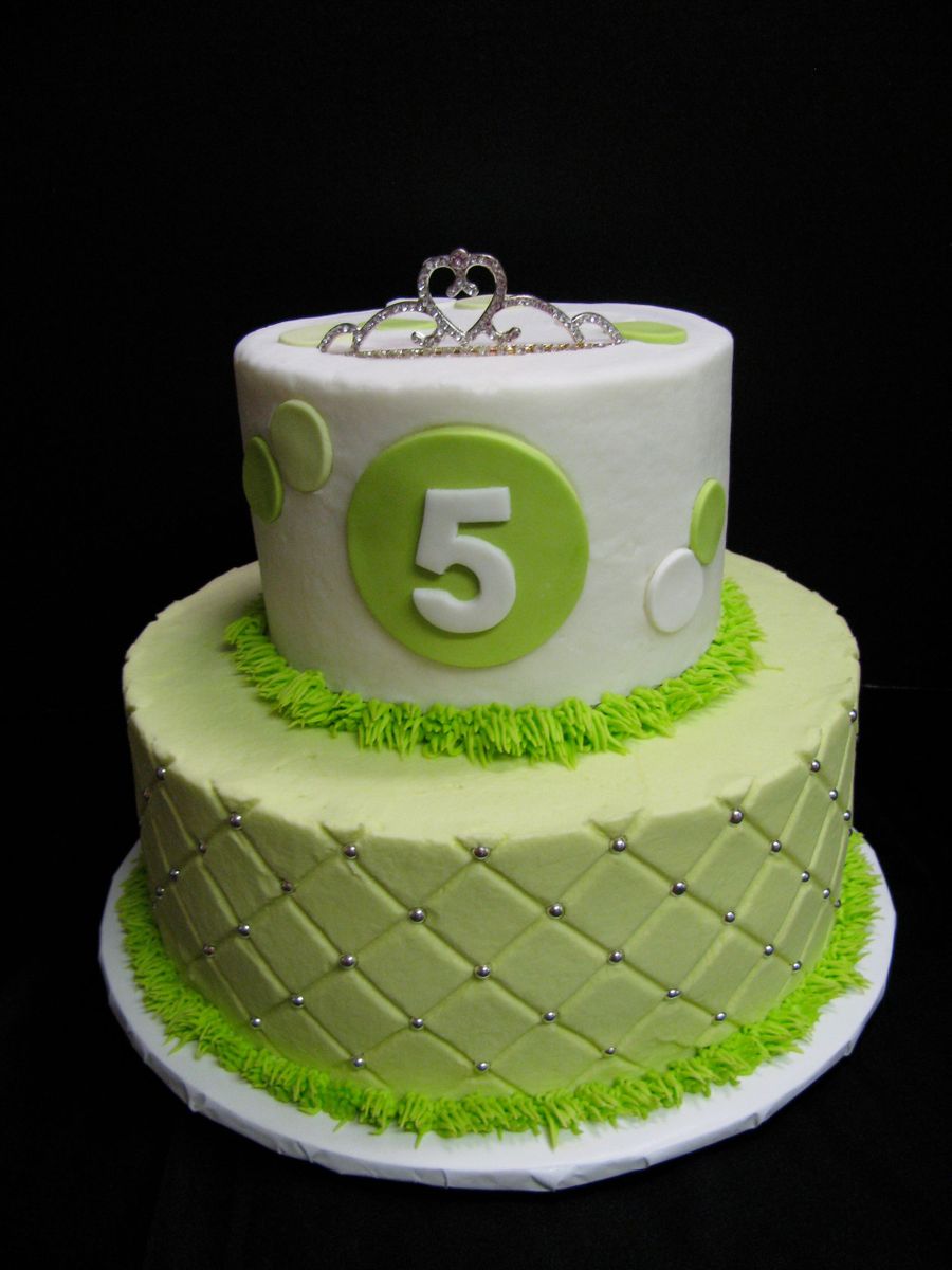 All BC with fondant polka dots and "5". Quilted impression mat on lower tier , silver dragees at each quilted intersection. Purchased tiara.