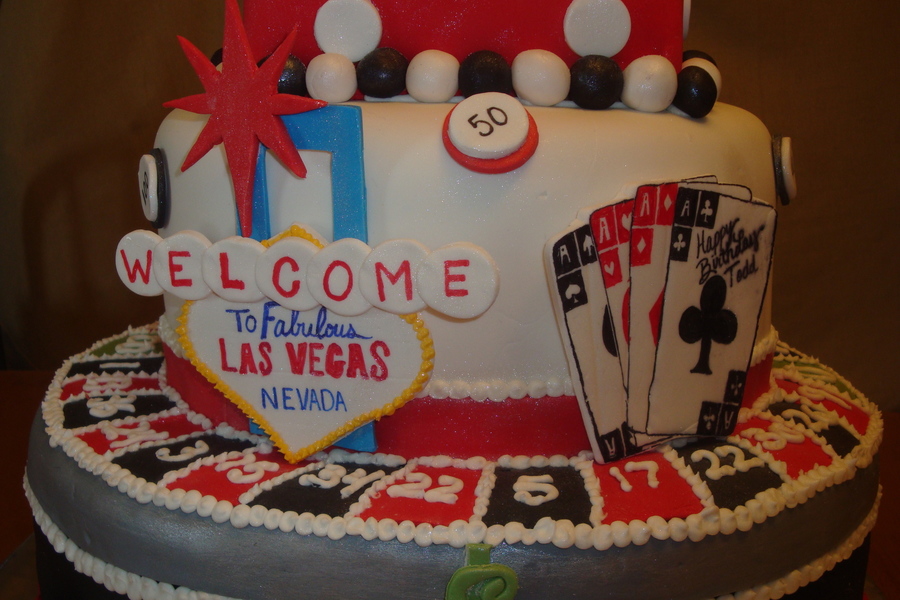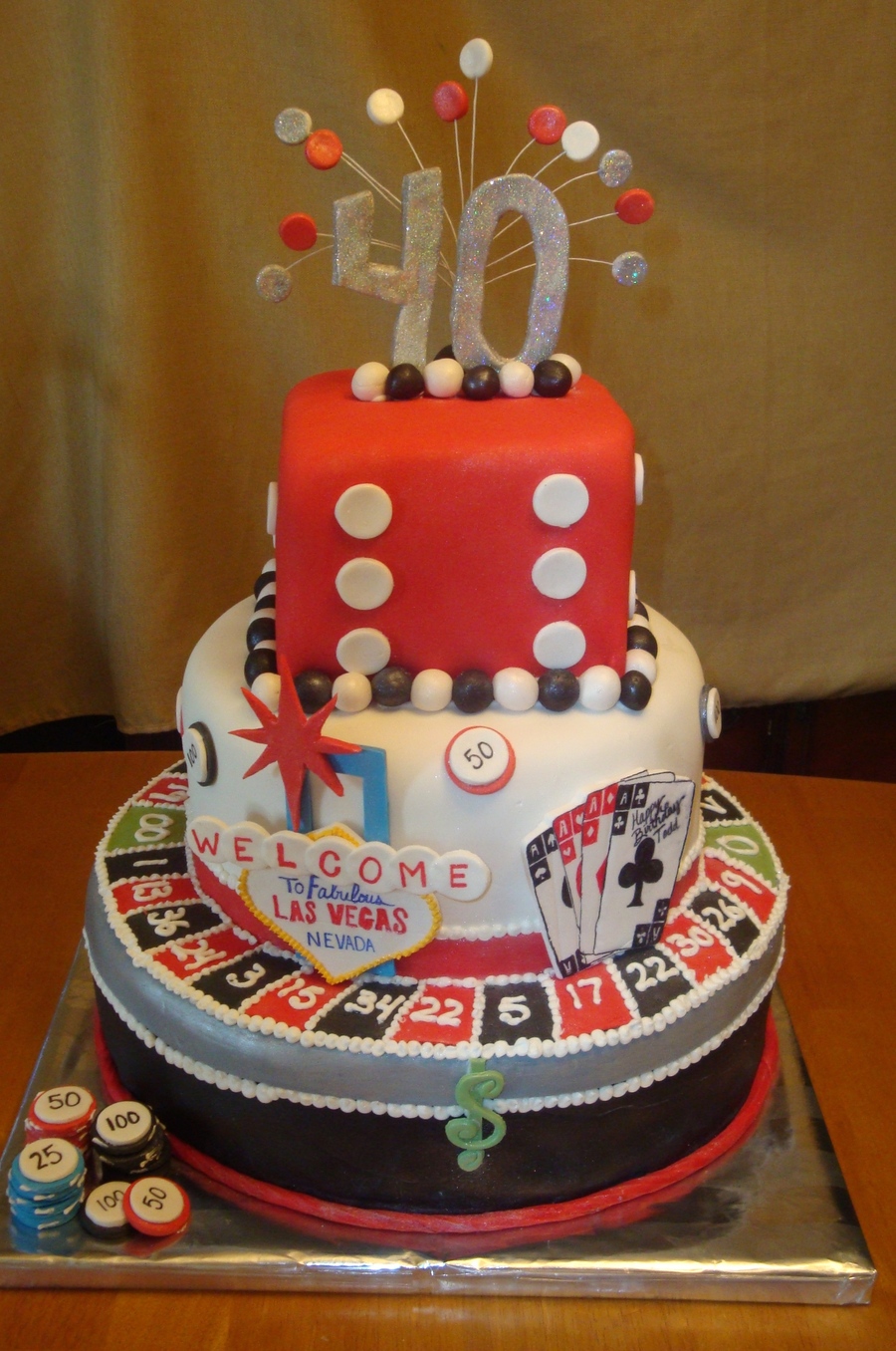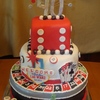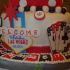 For my boss' 40th surprise party. The bottom and top layers are chocolate with oreo mousse and the middle was vanilla with lemon cream cheese. Each layer was covered in fondant. The Vegas sign, cards, poker chips, and "40" were gumpaste. I was so excited to use my disco dust for the first time! Thank you to all of my fellow CC'ers for inspiration. The cake was a hit!