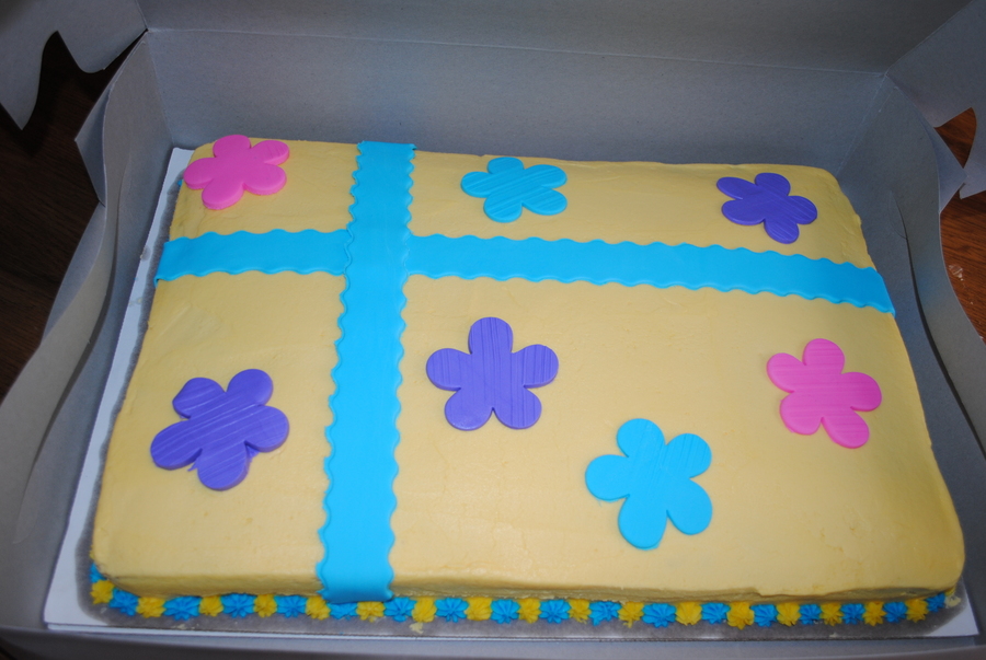 This was made for a friends birthday. She loved the other package cake I made but she wanted different colors and flowers instead of polka dots. I thought it turned out really cute.