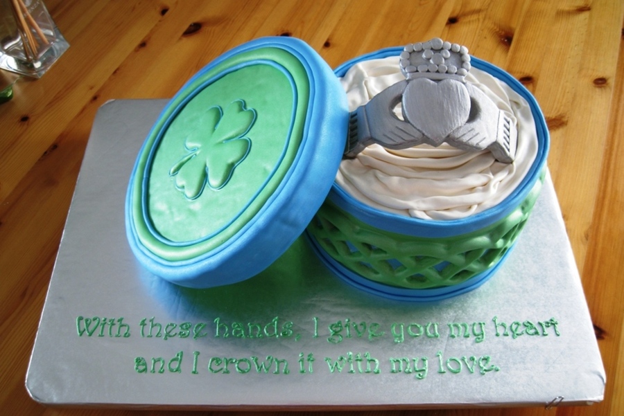 Cake dummy and foam lid covered and embellished in fondant. The claddagh was made out of fondant/tylose and painted with silver luster dust. Won 3rd place in the other cake category at the county fair!
