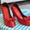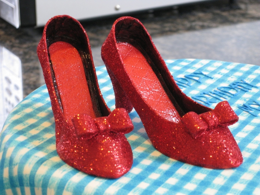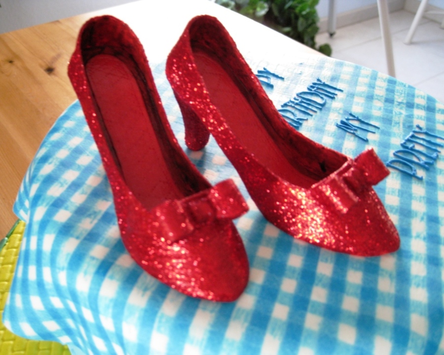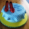 Cake dummy covered in fondant with fondant sprayed in gingham pattern laid over. Cake board covered in fondant and brick pressed with fondant emeralds to trim. Shoes are fondant/tylose and edible glitter. Won 3rd place in the birthday cake category at the county fair!
