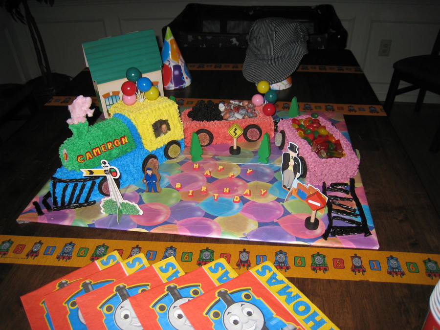 I made this train for my Grandson's 3rd Birthday. I used Bread Pans to bake the cakes in, then cut each in layers. I used Buttercream icing, oreos split in half for the wheels, cotton candy for the smoke, an ice cream cone for the stack, licorice for the train tracks, rock candy, jelly beans and a variety of candy to fill the train cars. Very easy!