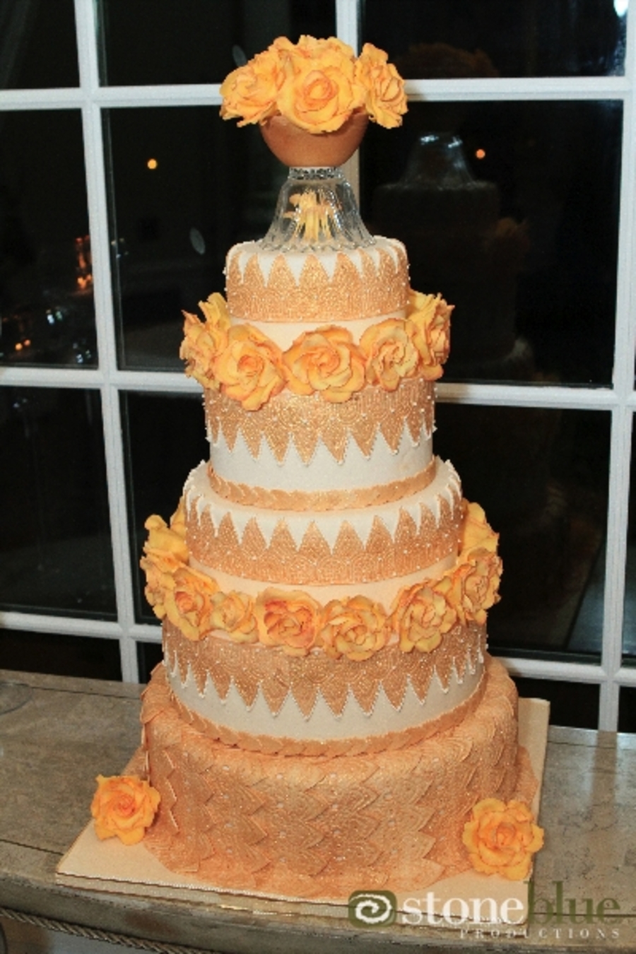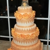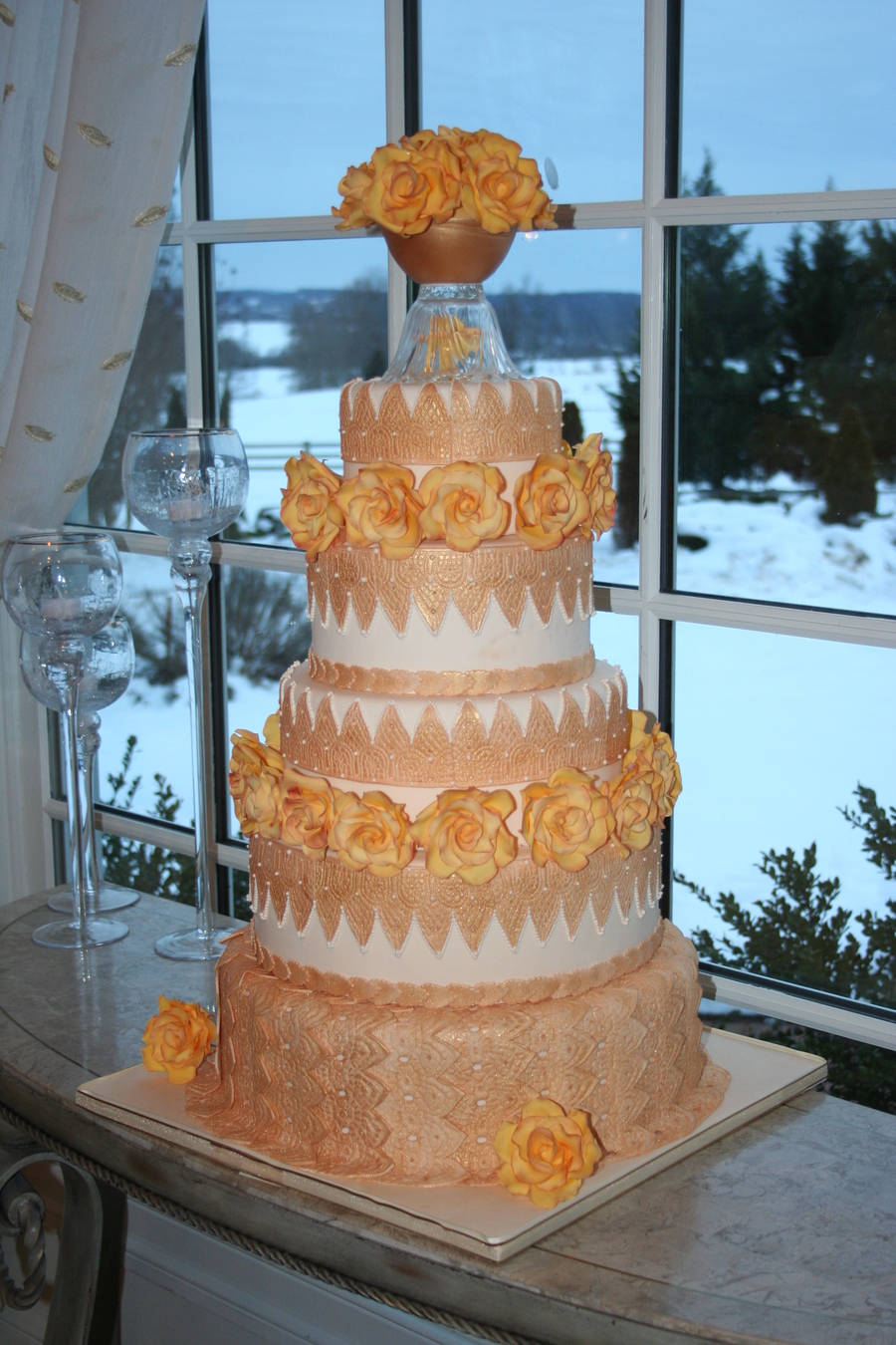 This cake was done for a local magazine that invited me to participate in their Bride of the Year Luncheon. They asked me to make a cake that was my idea of the cake for a fall wedding. My 15 year old daughter made half the roses with me. She is doing beautifully in learning how to work with sugar :) Cup is gumpaste, all the lace panels are fondant duated in gold lustre dust.