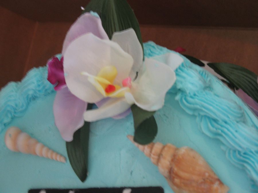 For a "take two" (second marriage) I made this cake for my friends bridal shower. The flowers and shells are from the dollar store.