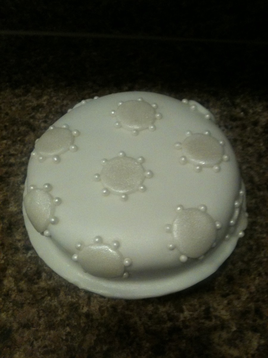 This was a multipurpose mini cake (birthday, new job, new apartment-6 in.). It's vegan yellow cake, vegan buttercream covered with vegan rolled buttercream, decorated with white dragees and Wilton pearl dust in white.