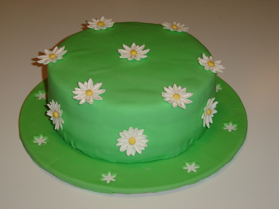 My first fondant cake. Gum paste daisies, covered cake round in fondant, used punch-outs for added detail.