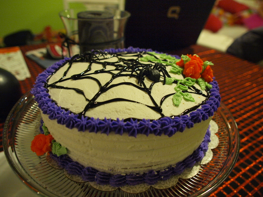 I sed the black gel found in the grocery store (baking aisle) but found that I lacked control, and it tended to "goop" out in places. If I were to do again... I would definately tint buttercream black and use a bag with a tip #2 to have laid out my spider web!