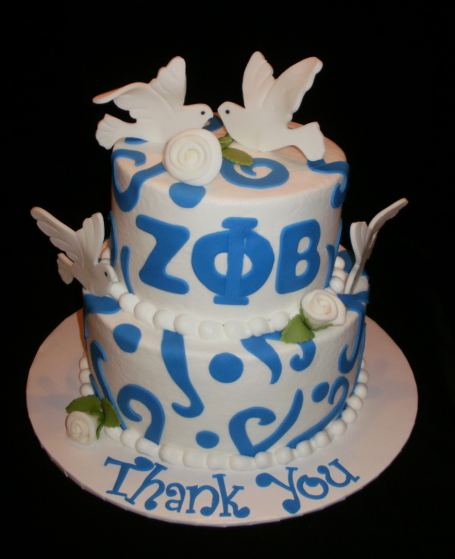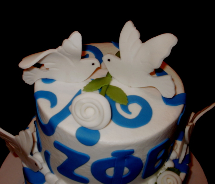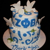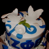 This is a 6" yellow cake and an 8" chocolate cake iced in buttercream. The doves, roses and swirls were done in fondant. The woman in charge was retiring so they wanted to thank her with a cake.