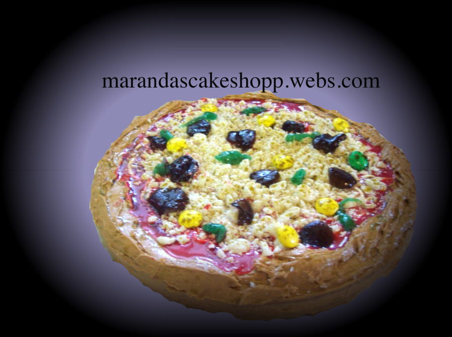 Pizza Cake for my boyfriends birthday, all edible, Orange, topping are white chocolate chopped up and different flavors of gummi bears melted, hand painted the "crust" let me know what you think!