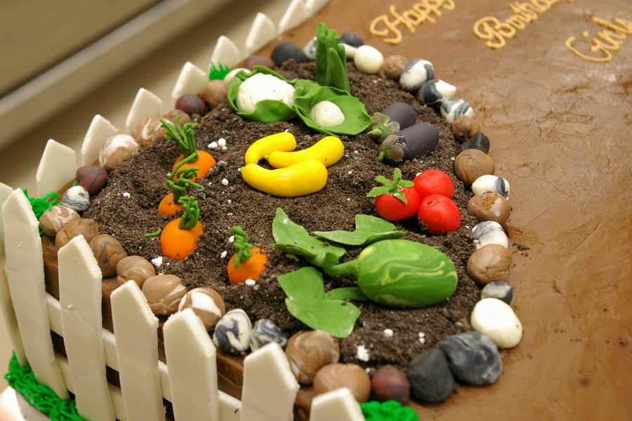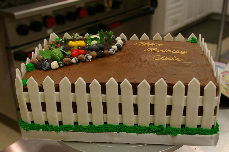 Amazing Chocolate cake with chocolate mousse filling, Chocolate frosting and gumpaste picket fence as well as gumpaste veggies. Oreo "dirt" and gumpaste rocks.