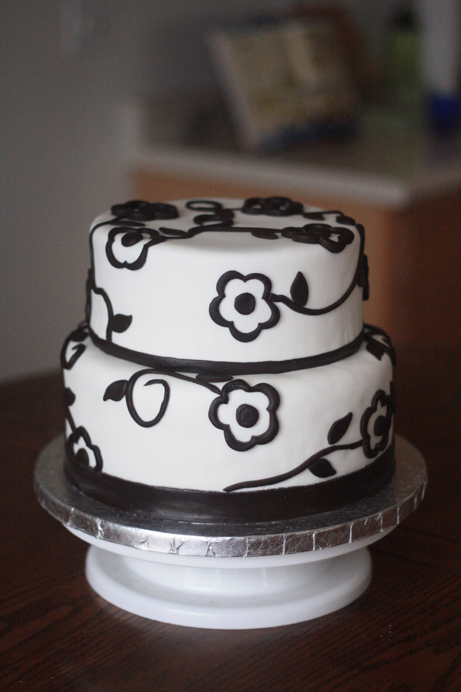 Chocolate Cake. Satin Ice. Accents in Satin Ice Dark Chocolate. Cakes are 10" and 8".