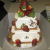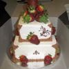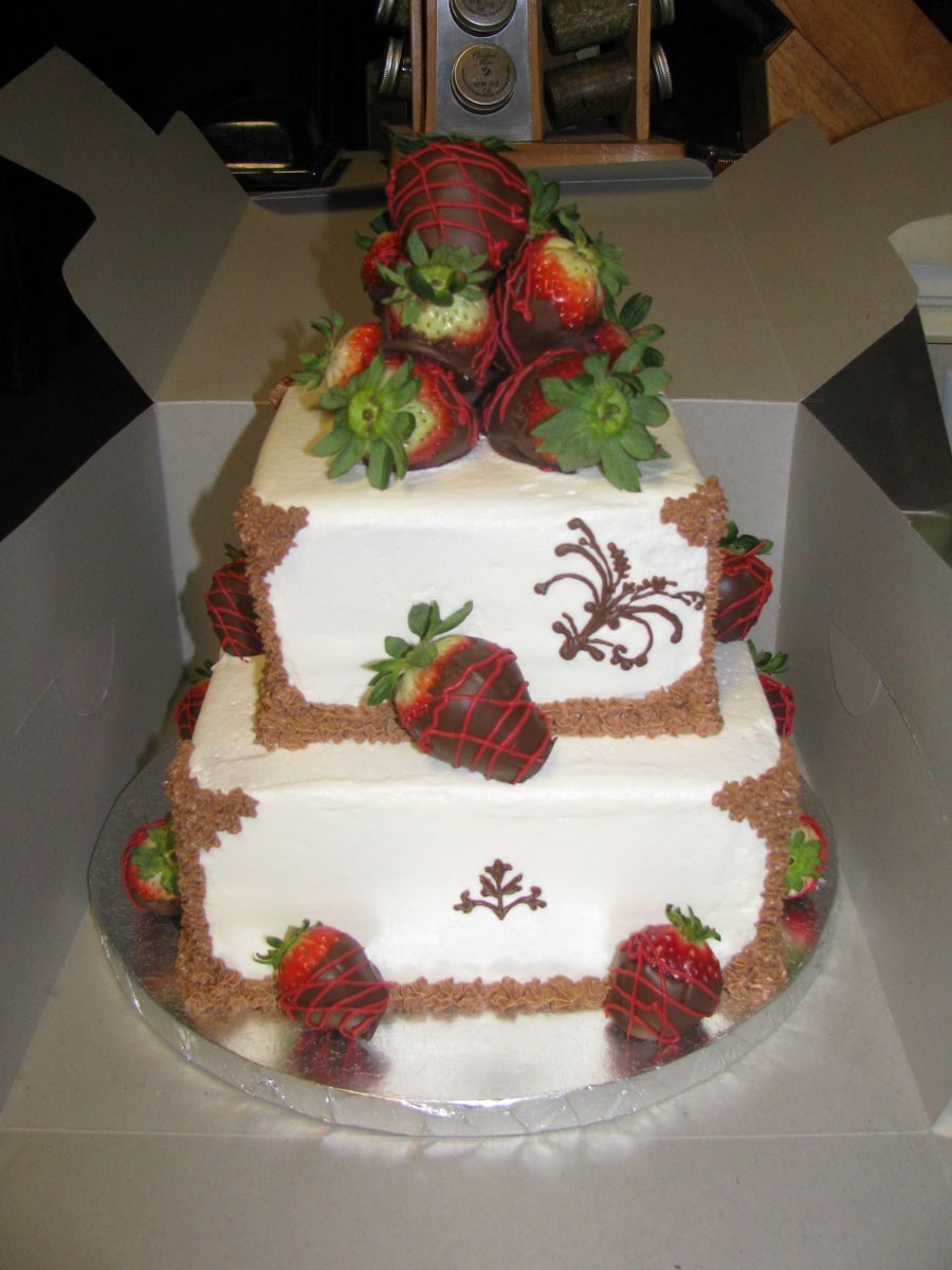 Customer wanted an elegant cake for her dad's retirement party. Vanilla cake with strawberry filling and chocolate covered strawberries. Cake is all buttercream and with chocolate transfer accents.