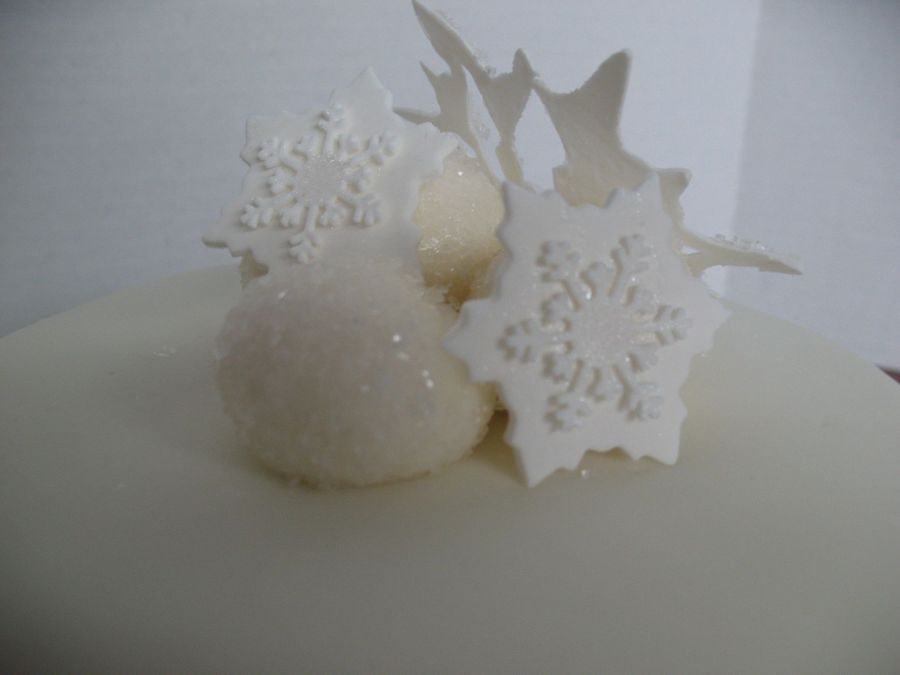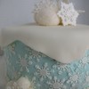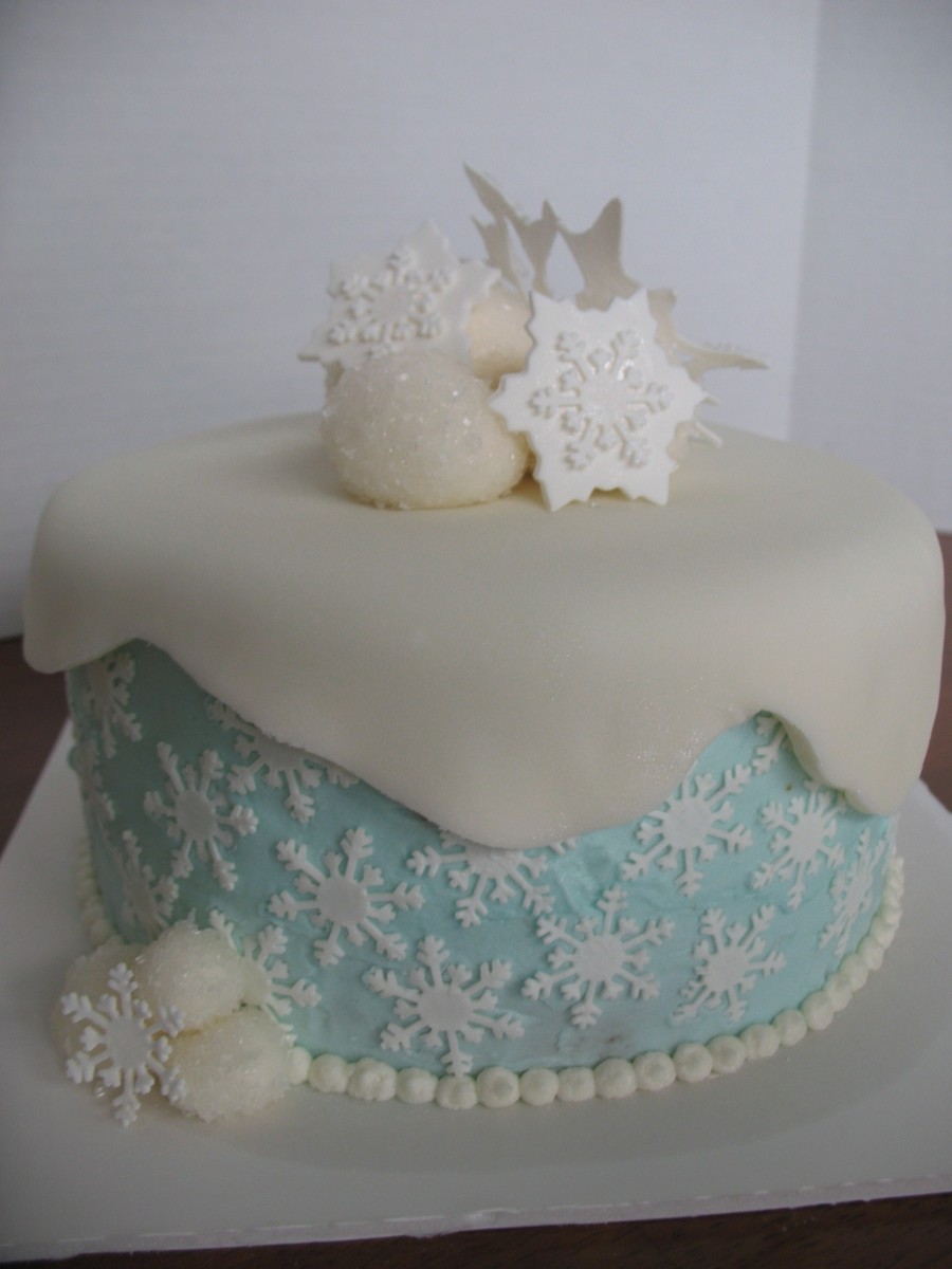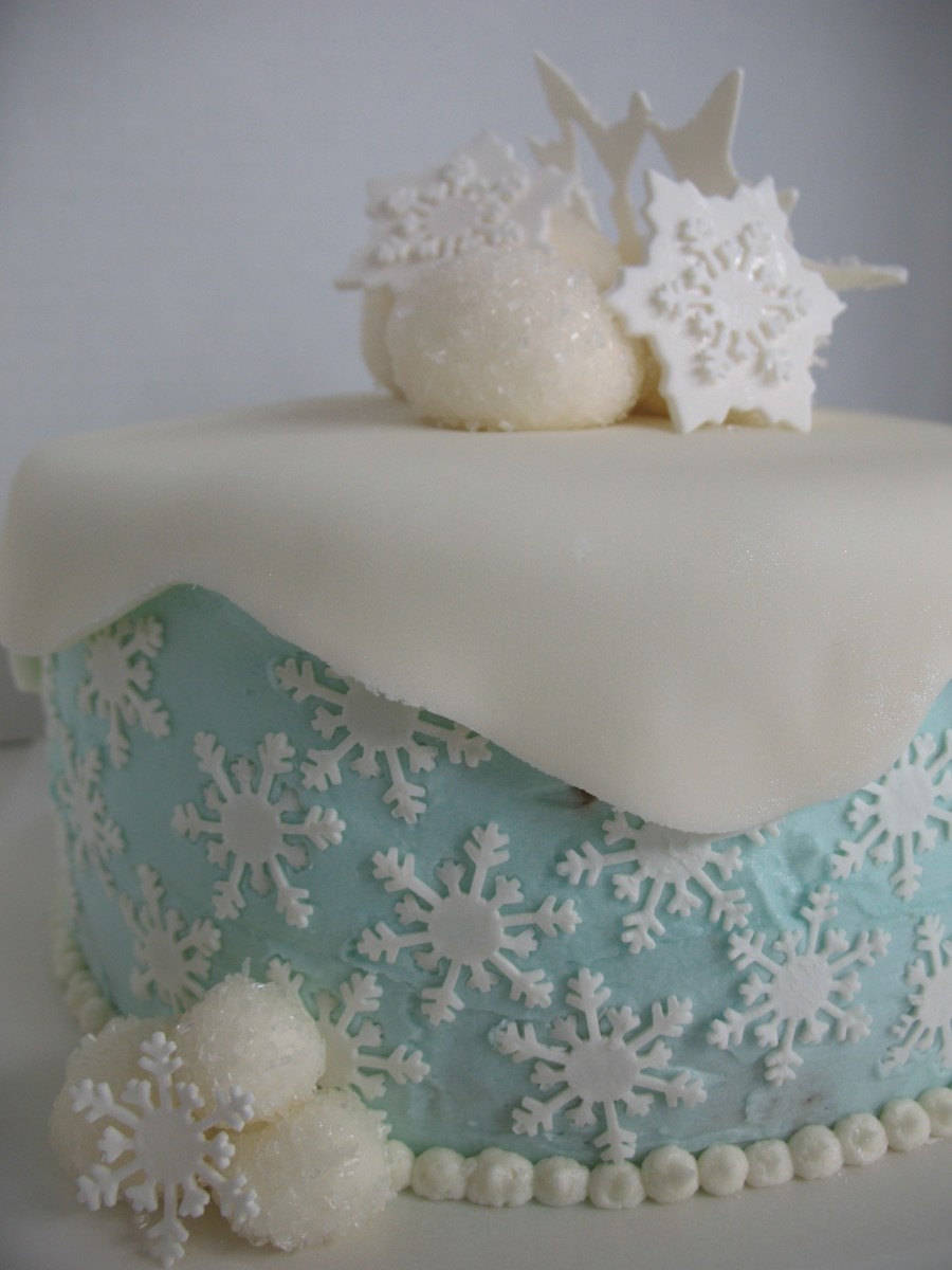 Based on an idea I saw earlier using a Martha Stewart cutter to cut out the gumpaste snowflakes. It worked amazingly well. Fun and simple concept. WASC cake and vanilla buttercream filling. Given to a coworker with a broken shoulder and 4 beautiful daughters who will surely enjoy it.