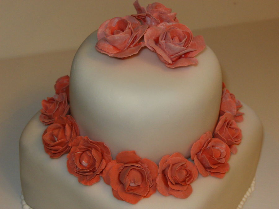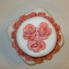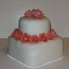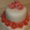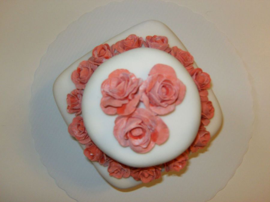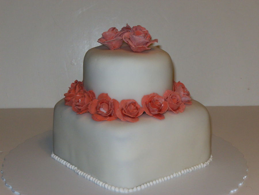 6" square tier on bottom and 4" tier on top. 18 roses made from gum paste, royal icing bead border.