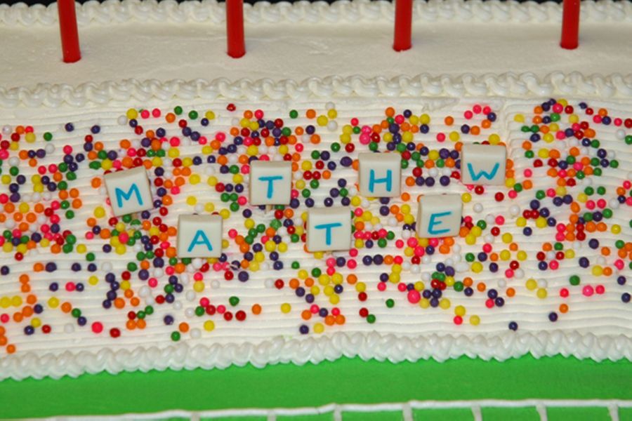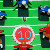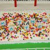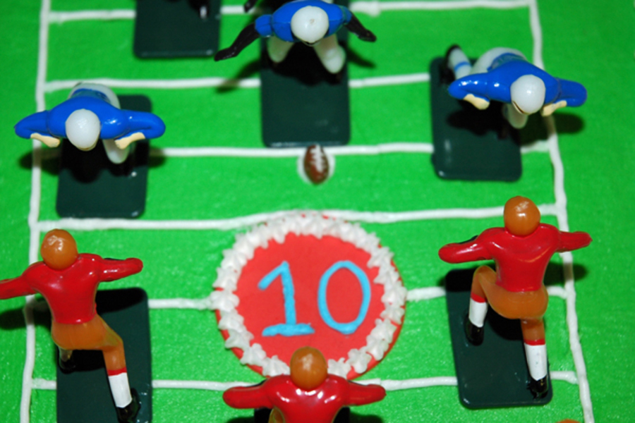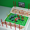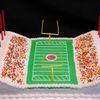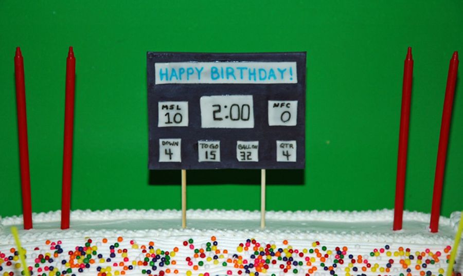 Football stadium cake- all buttercream except logo on field and scoreboard, both of fondant/gumpaste. Wilton players and goalposts. Tootsie Roll ball with icing laces! Ju mbo sprinkles for "fans". Thanks to StaceyCakes75 for her cake and description. My son was very happy!